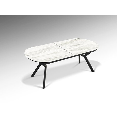 Раздвижной обеденный стол из металла с черной матовой отделкой и столешницей из МДФ с высокостойкой меламиновой поверхностью, глянцевой отделкой из белого мрамора, с черными матовыми краями. Расширяется до 2,85 метра.