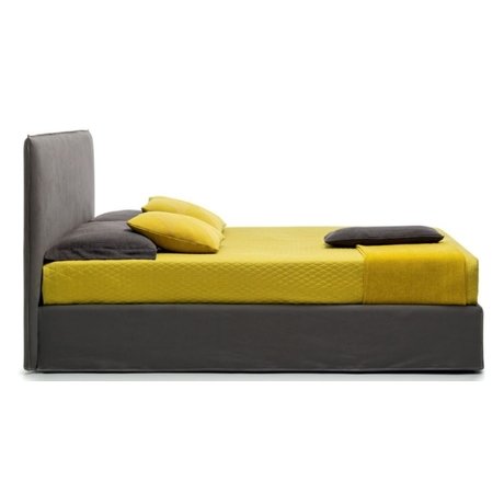 Особую радость эта кровать доставит приверженцам стиля «лофт». Прямое и довольно плоское мягкое изголовье, абсолютно ничем не декорированное, смотрится очень стильно, особенно в обивке цвета графита. К этой широкой уютной кровати «полагаются» подушечки разной формы и размера, две из которых контрастного жёлтого оттенка. Вот такой «луч света» – и кровать стала ещё выразительнее.