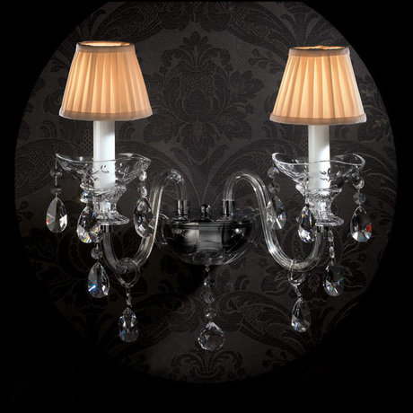 Бра 2-х рожковое с основанием цвета хром и декоративными подвесками из прозрачного хрусталя. Текстильные непрозрачные абажуры бежевого цвета приглушают свет ламп, направляя его на кристаллы подвесок.