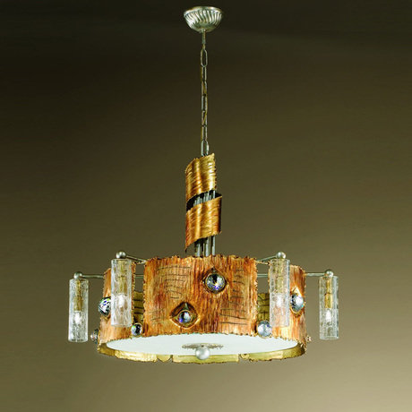 Подвесной светильник из кованного металла с имитацией ствола дерева. Прозрачные плафоны из муранского стекла. Декор: прозрачный хрусталь Swarovski на декоративной основе. Цвет арматуры: серебряный с золотом. Высота светильника регулируется за счет звеньев цепи. Дизайн: Enrico de Girardi. По индивидуальному заказу возможны различные модификации и варианты отделки.