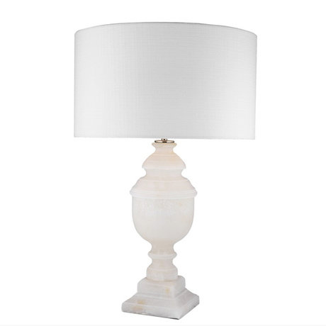 Настольная лампа Table Lamp Trophy на основании кремового цвета из камня алебастра. Текстильный абажур белого цвета скрывает лампу.