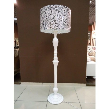 Торшер выполнен в современном стиле. Необычная фигурная ножка торшера в отделке белый блестящий лак. Круглый классический абажур сделан из коллекционного текстиля в черно-белых тонах с замысловатым абстрактным рисунком.